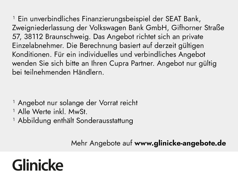 ³ Ein unverbindliches Finanzierungsbeispiel der Volkswagen Bank GmbH / Gifhorner Str. 57 / 38112 Braunschweig. Das Angebot richtet sich an gewerbliche Einzelabnehmer. Die Berechnung basiert auf derzeit gültigen Konditionen. Für ein individuelles und verbindliches Angebot wenden Sie sich bitte an Ihren Seat Partner. Angebot nur gültig bei teilnehmenden Händlern.
